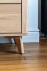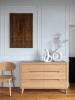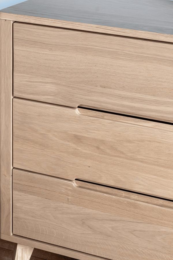 La structure est entièrement en chêne massif pour les parties visibles, avec un arrière en bois massif ou abouté 20 mm. Les tiroirs sont assemblés à queues et équipés de coulisses avec système "push" pour une ouverture sans poignées, garantissant un rendu sobre et contemporain. Les pieds, dessus, côtés et plancher sont également en chêne massif pour une robustesse et durabilité maximale.