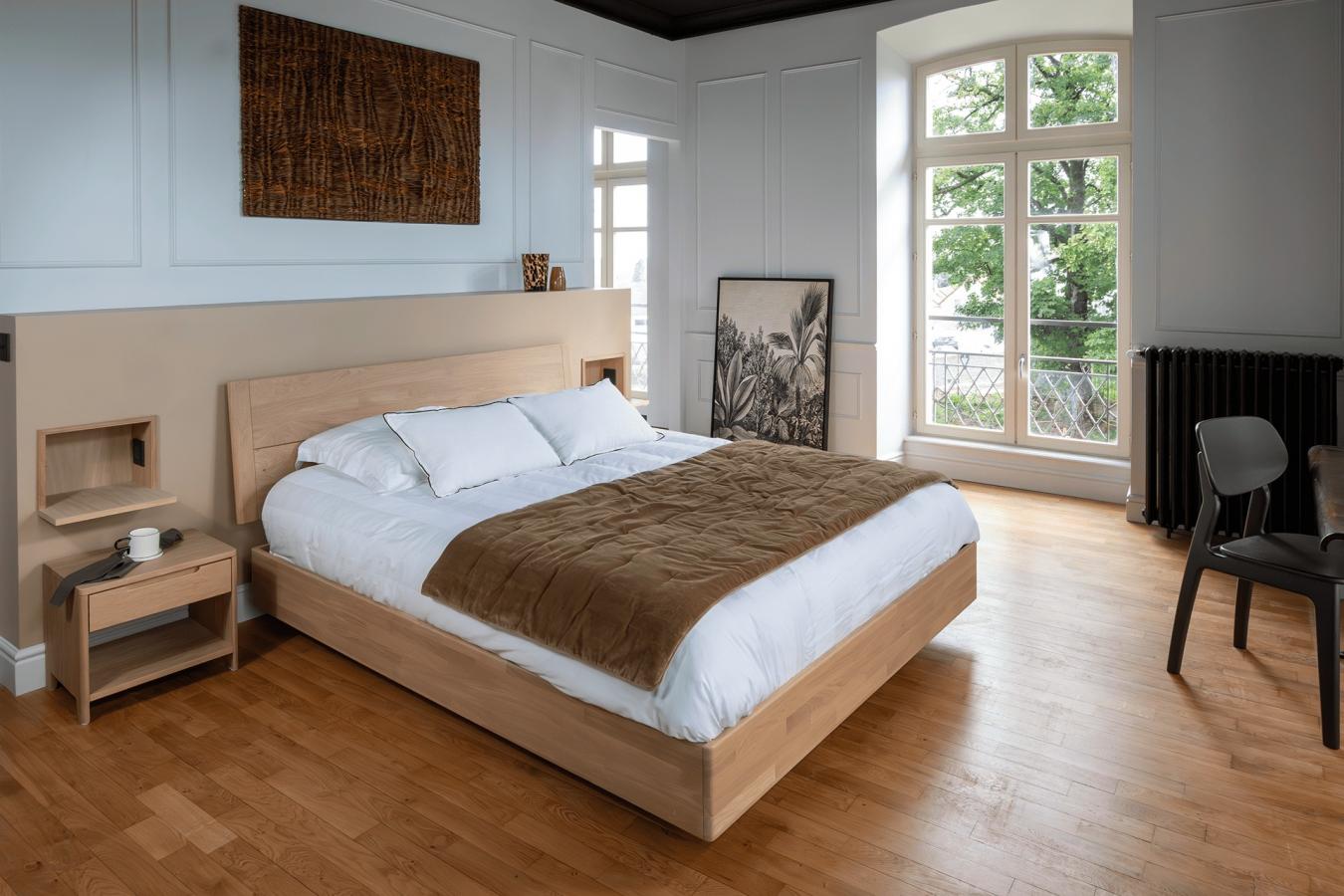 Fabriqué en chêne massif, ce chevet allie solidité et finition soignée. Le dessus, les côtés et le plancher sont en chêne massif, et le fond est en chêne massif ou abouté de 20 mm pour plus de robustesse.