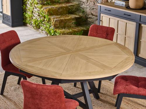 Ensemble table ronde 150 cm avec allonge + bahut 2 portes coulissantes en chêne massif noir mat