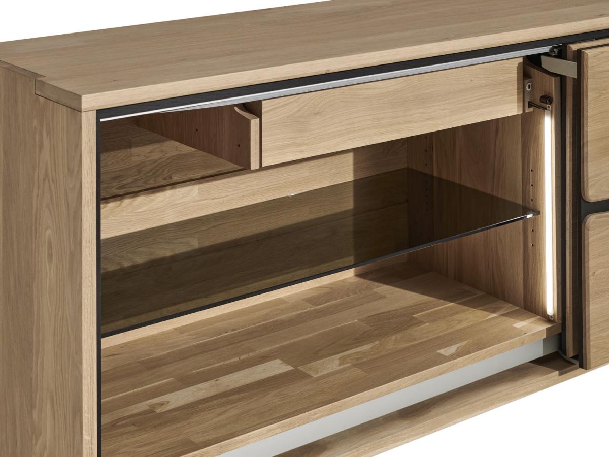 | Tiroirs | Assemblés à queues dans les quatre angles. Façades rapportées: un panneau "compact" noir mat + décor chêne massif comme pour les portes. Glissières avec amortisseurs et système de réglage en hauteur intégré. |