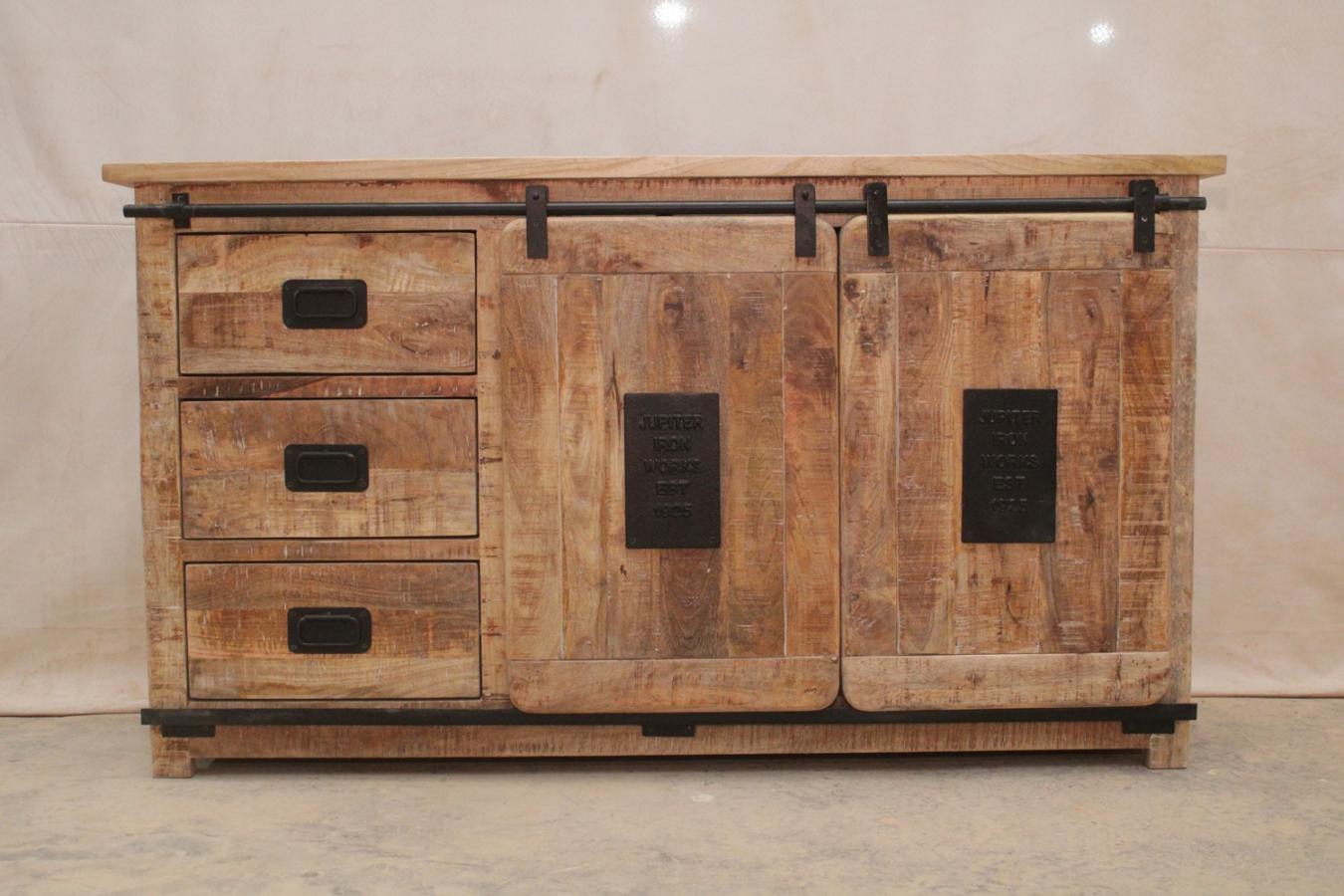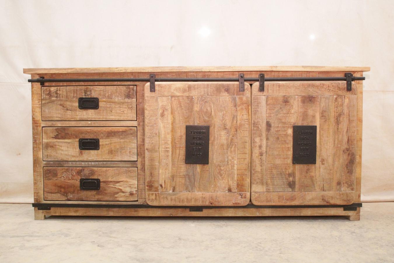 Le buffet INDOUSTRY 2 portes coulissantes et 3 tiroirs, en manguier 100% massif et métal, vous permettra de compléter ou de créer un ensemble de grande qualité à prix abordable pour votre intérieur. Il est disponible en deux dimensions afin de s'adapter à l'espace disponible dans votre pièce.
