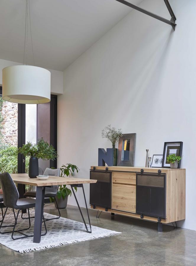 L'enfilade FUSION meublera votre séjour et vous apportera du rangement grâce à ses 2 niveaux de rangements derrière chaque porte (2 portes en métal coulissantes et 1 porte en bois battante) et son tiroir.
