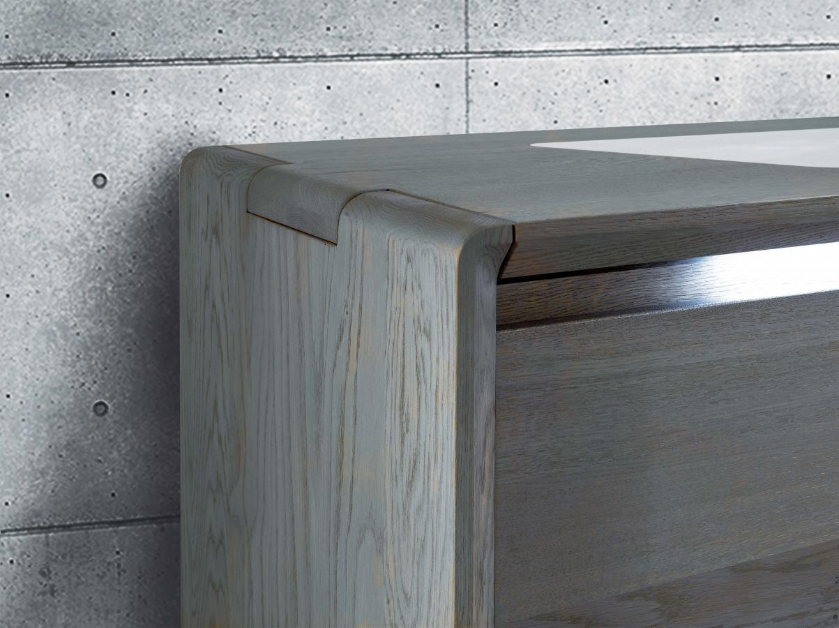 | Structures | Meubles sur socle en retrait. Assemblage de la structure à "Queues Droites" avec arrondi 25mm sur l'angle. Chanfrein profilé et raccordé sur tout le pourtour de la façade. Côtés, planchers et dessus épaisseur visuelle 40mm, panneaux massifs 20mm avec recharge ou 40mm massif. Arrière : panneaux à plate-bande épaisseur 10mm, maintenus en rainure sur les 4 côtés. Incrustation d'un décor Céramique sur le dessus. |