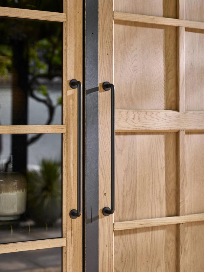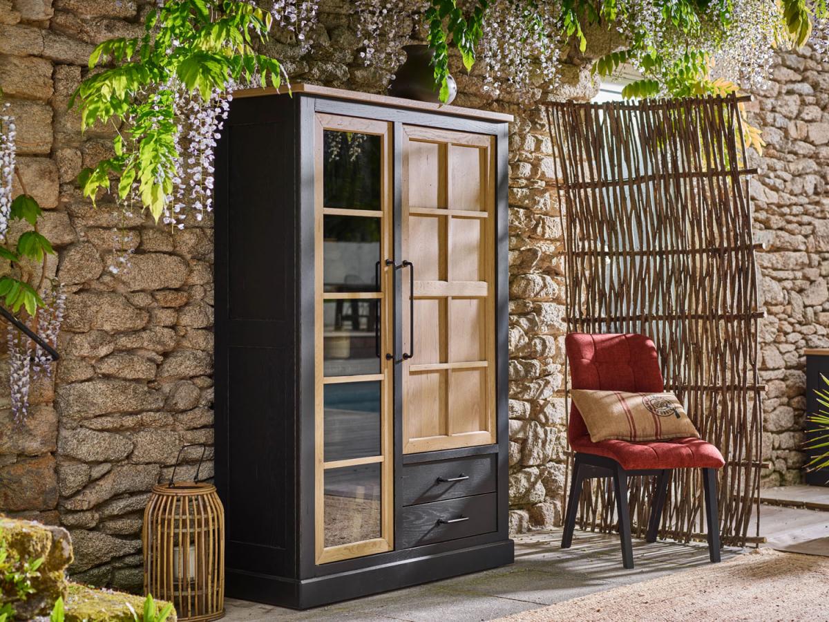 La grande vitrine de la collection ODYSSÉE de style atelier s'insérera parfaitement dans votre séjour et vous offrira du rangement grâce à ses quatre tablettes derrière la porte vitrée, ses 2 tablettes derrière la porte en bois et ses deux tiroirs.