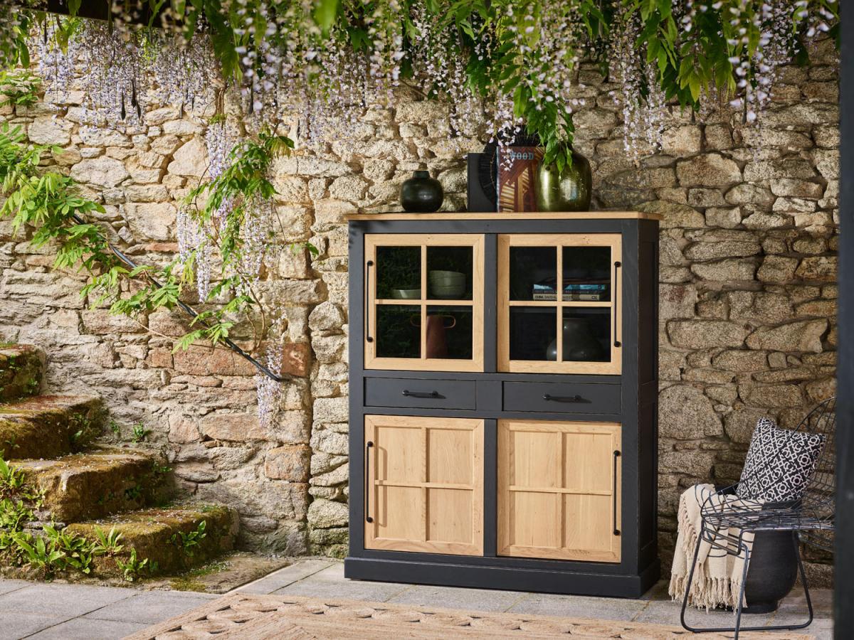 La vitrine de la collection ODYSSÉE de style atelier s'insérera parfaitement dans votre séjour et vous offrira du rangement grâce à ses deux grandes tablettes derrière les portes.