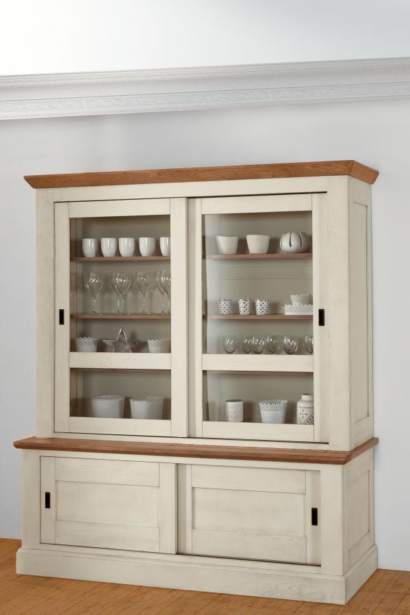 Le grand bahut ROMANCE meublera votre séjour et vous apportera du rangement grâce à ses nombreux compartiments fermées de portes vitrées et en bois.