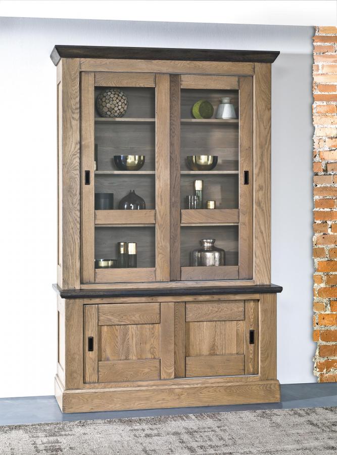 | Étagères | Épaisseur 20mm chêne massif abouté ou non, réglables sur taquets métalliques. Les tablettes intérieures, y compris celles derrière les portes vitrées, sont toujours en teinte 26, quelle que soit la teinte du meuble. |