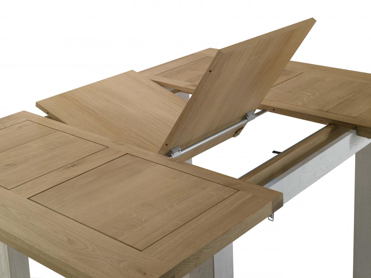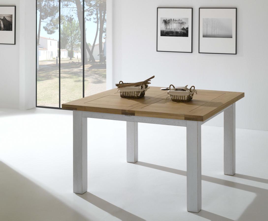 La table carrée WHITNEY comprend une allonge portefeuille de 56cm par défaut pour accueillir 6 à 8 couverts.
