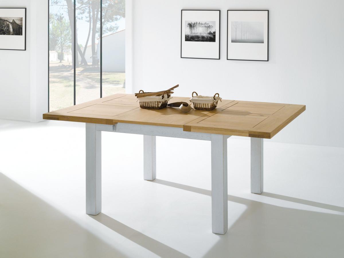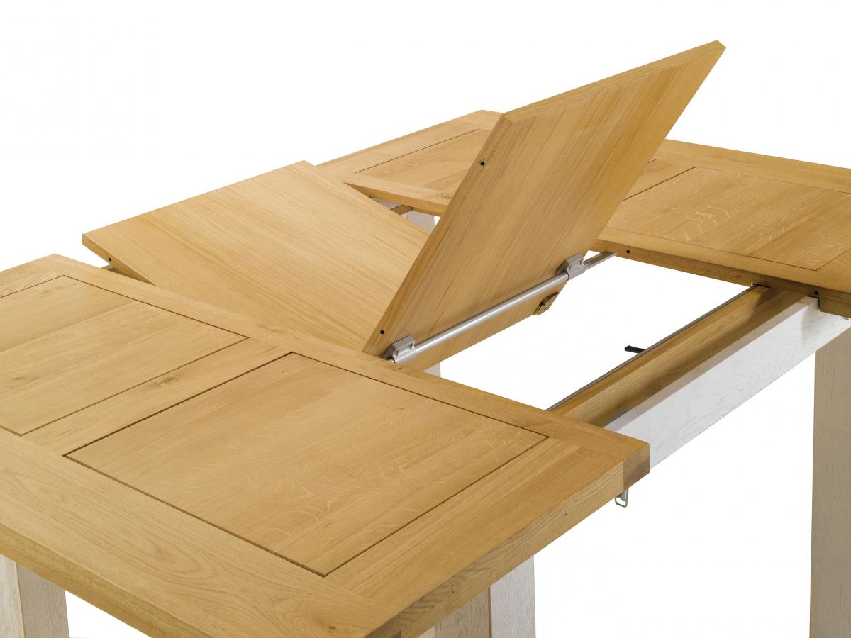 La table carrée ROMANCE comprend une allonge portefeuille de 56cm par défaut pour accueillir 6 à 8 couverts.