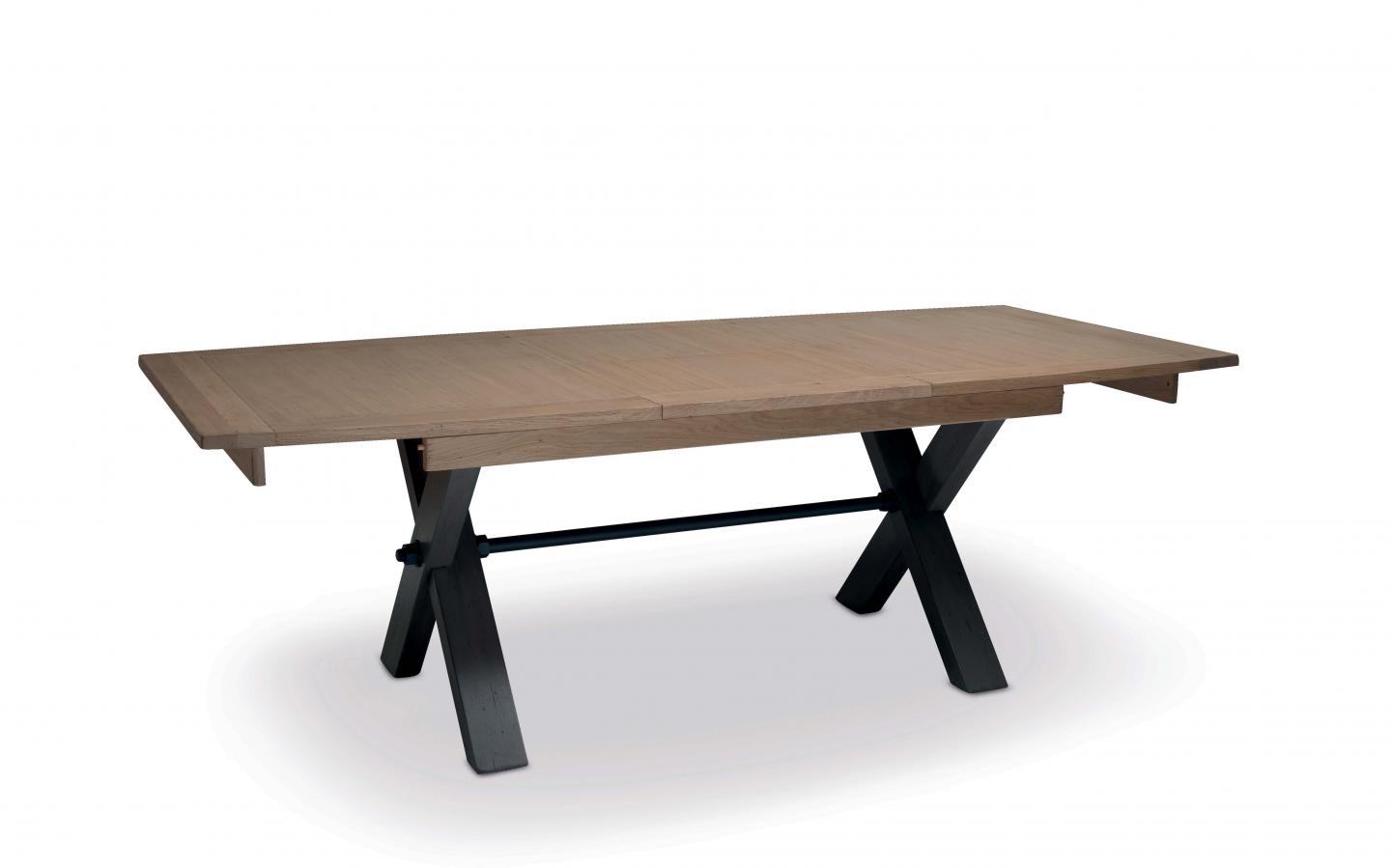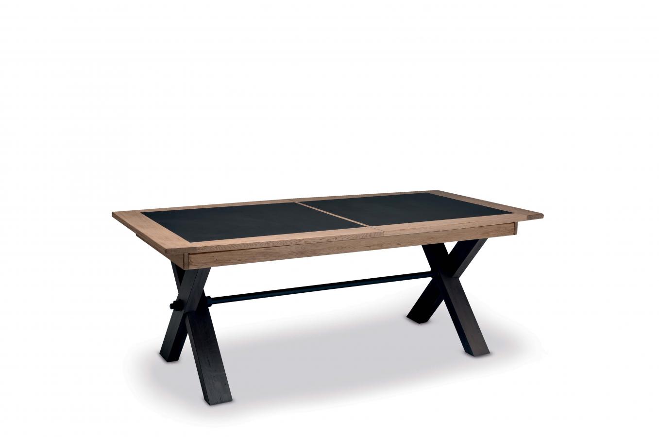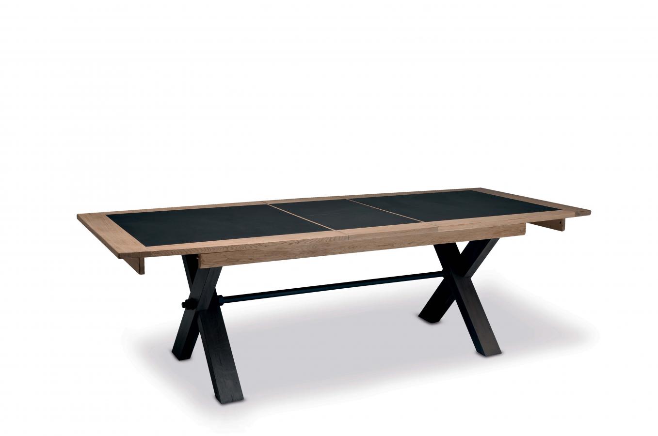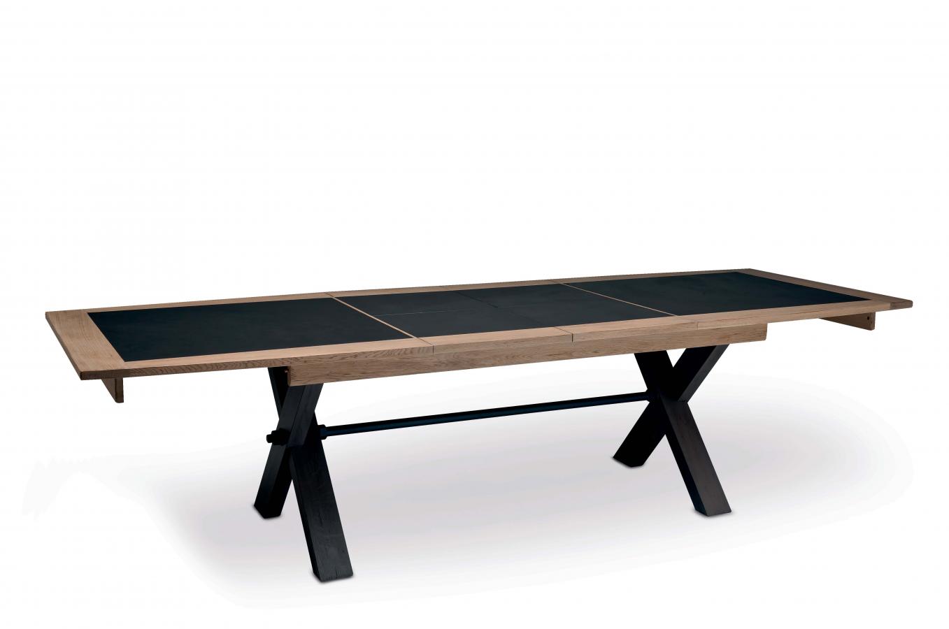 La table avec pieds en X MAGELLAN comprend des allonges portefeuilles pour accueillir 6 à 12 couverts en fonction du modèle.