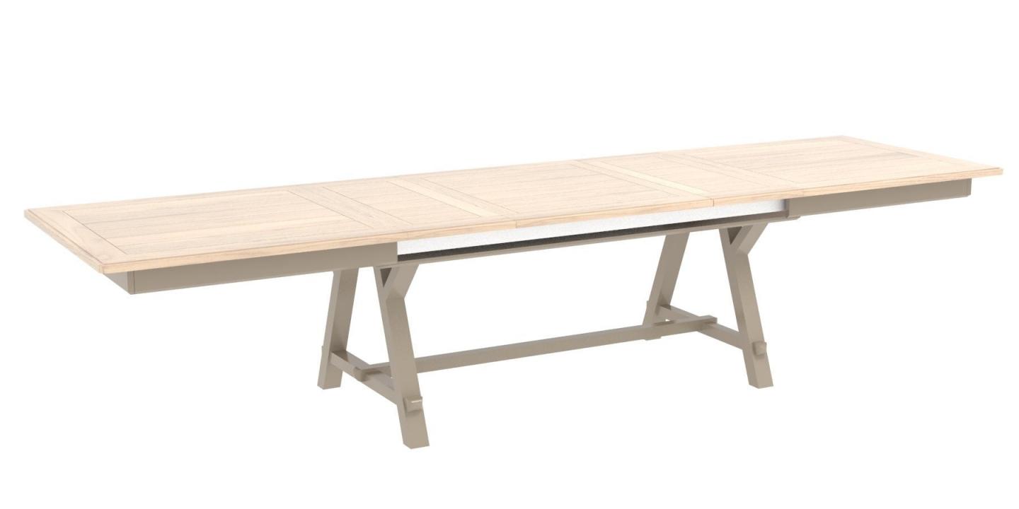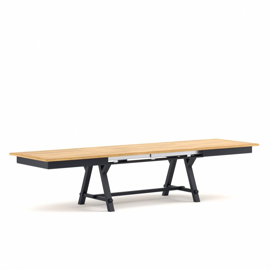 - Longueur 200 cm : 1 allonge portefeuille de 80 cm + 2 allonges portefeuille de 40 cm, extension possible jusqu’à 360 cm. La première allonge utilisée est celle de 80 cm, et les deux allonges de 40 cm ne peuvent être utilisées qu’ensemble.