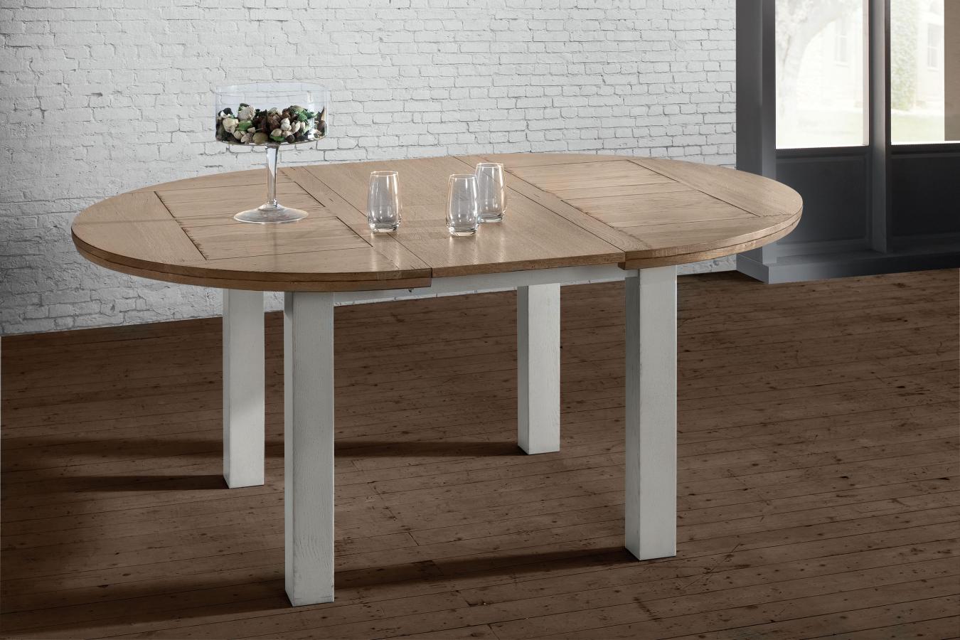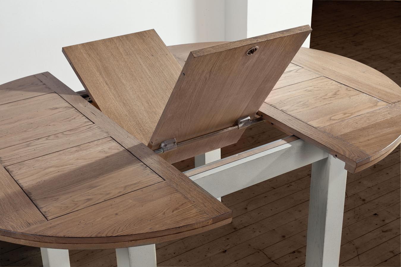 La table ronde ROMANCE, d'un style campagne chic moderne, comprend une allonge portefeuille de 39cm.