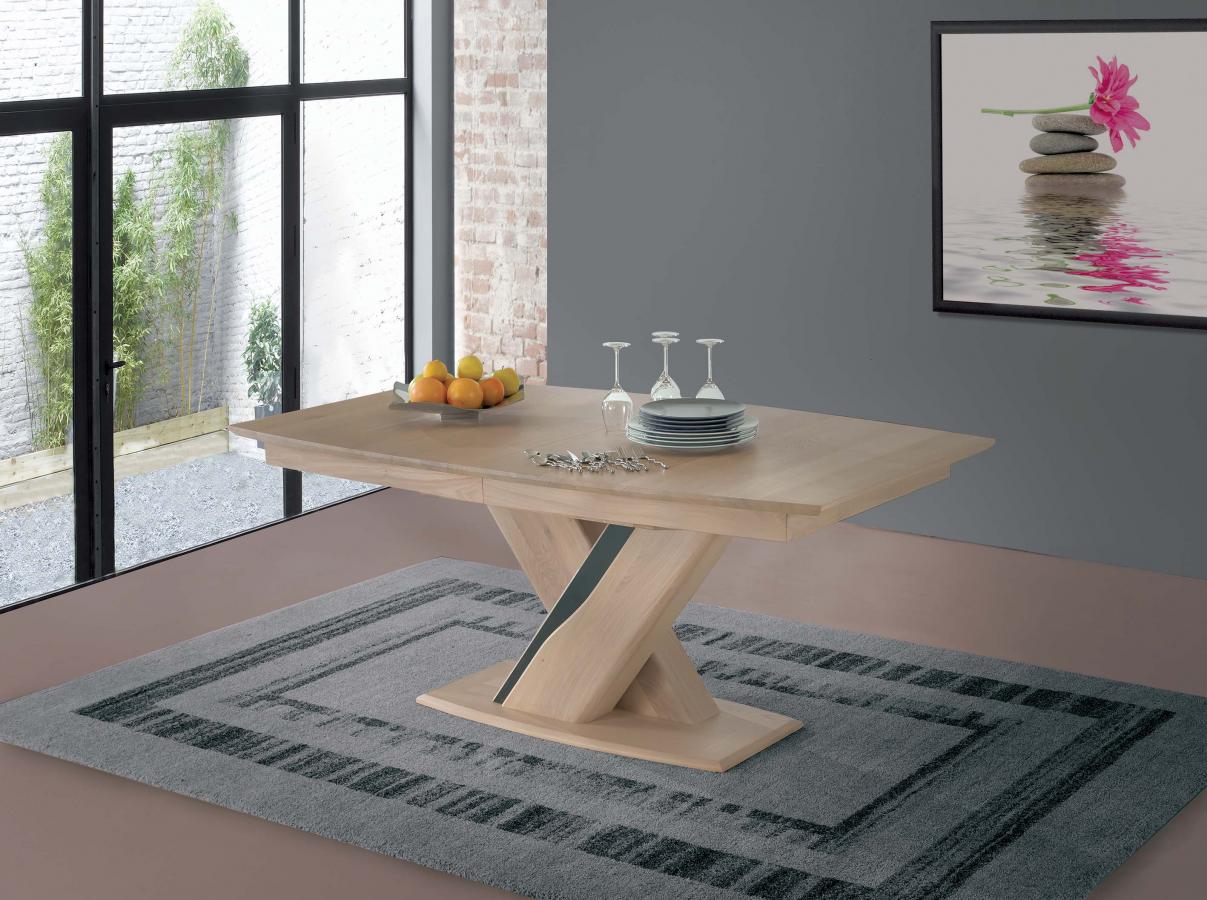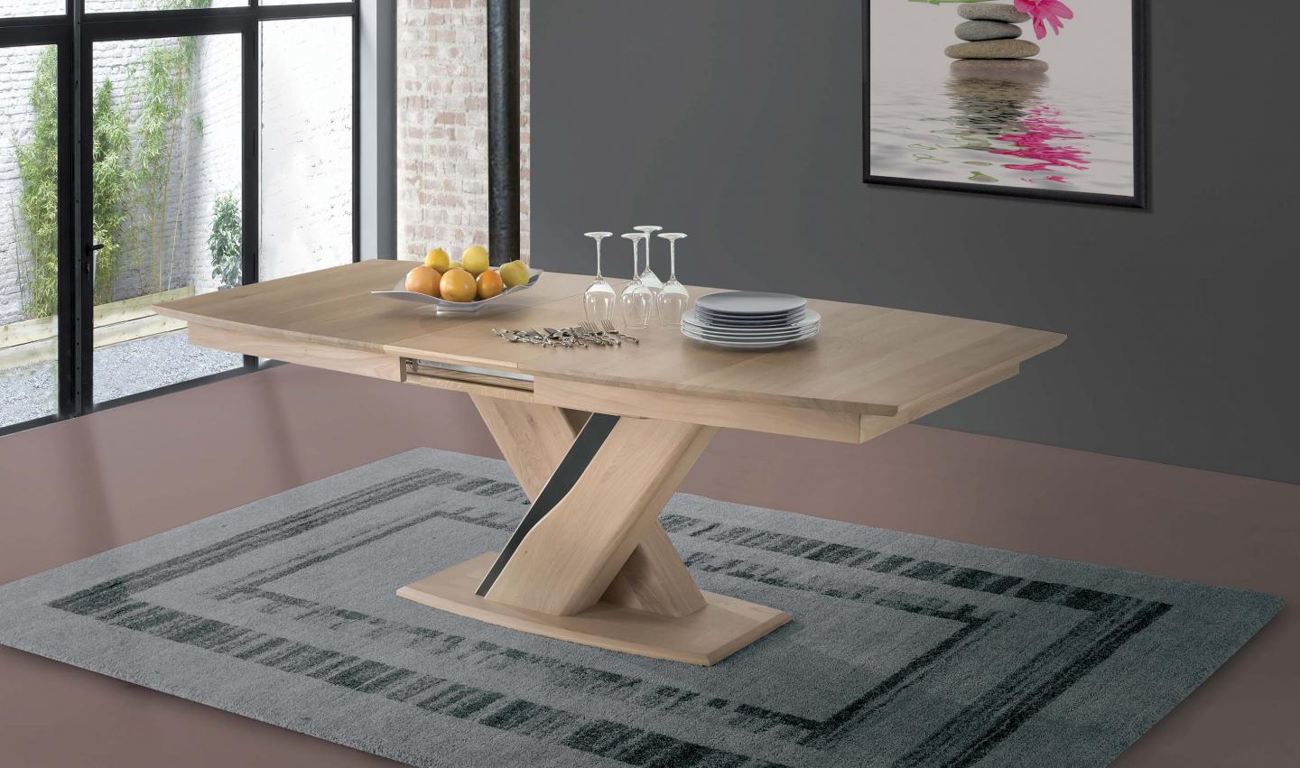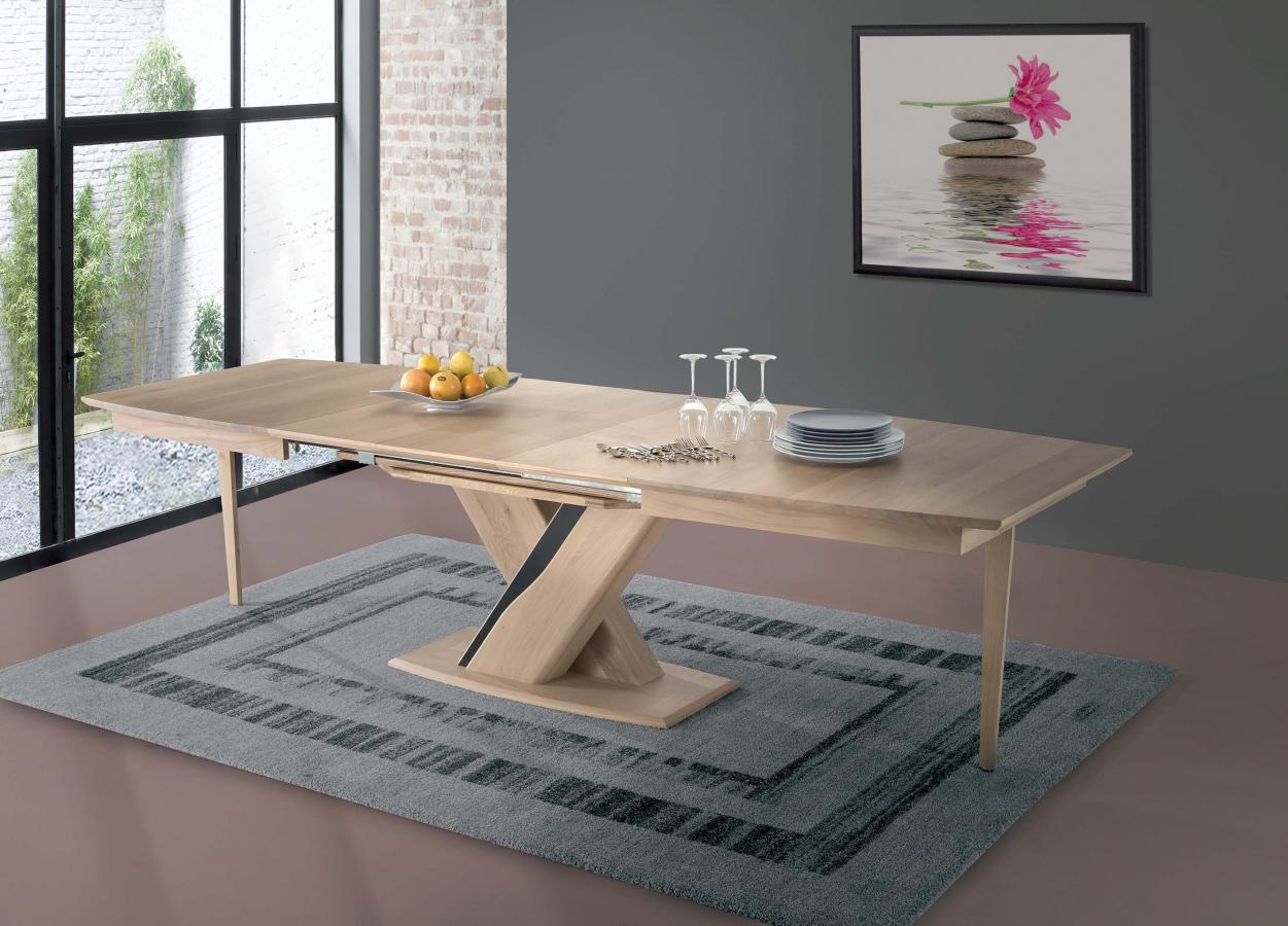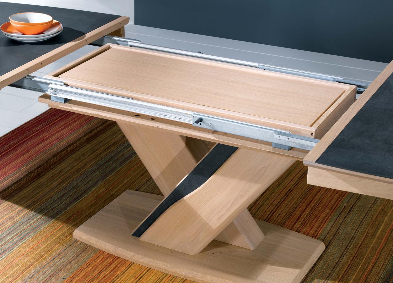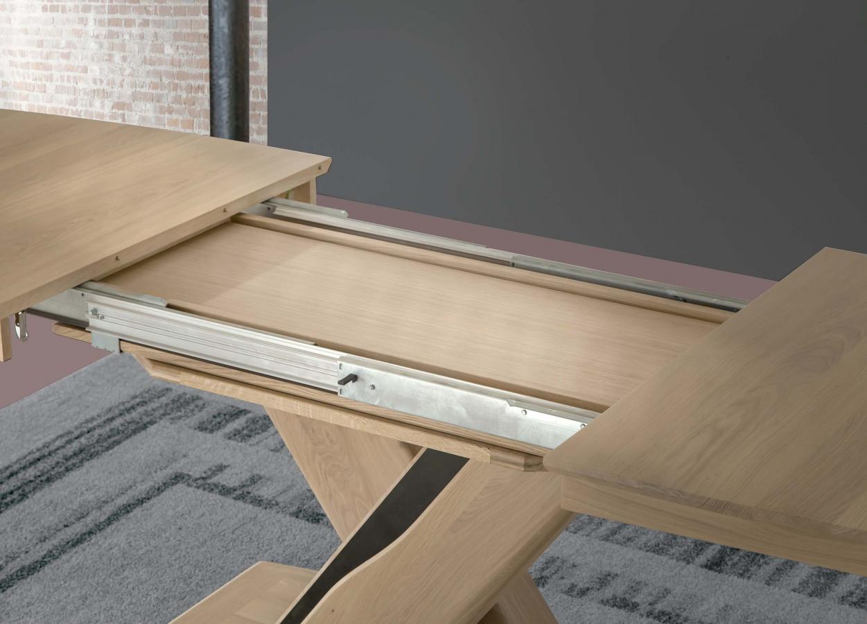 | Allonges | 1 allonge traditionnelle de 40cm (comprise). Possibilité de 1 ou 2 allonges supplémentaires de 40cm + pieds de soutien. Les allonges traditionnelles sont en panneaux de particules plaqués chêne 9 / 10. Elles se rangent toutes sous le plateau. |