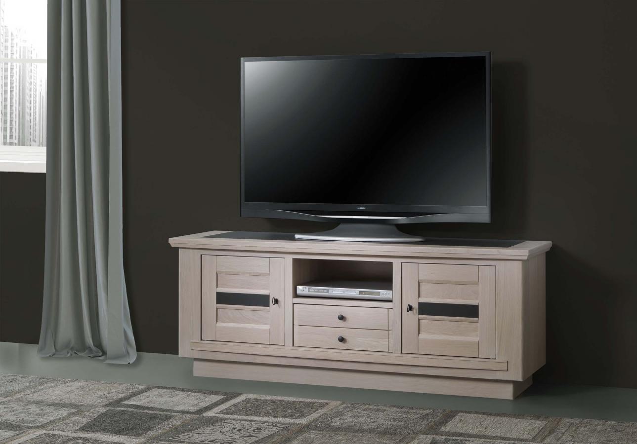 Le meuble TV de la collection BELEM, fabriqué en France, s'insérera parfaitement dans votre salon et vous offrira un grand espace de rangement grâce à ses deux tablettes (derrière les portes), à son tiroir et à sa niche centrale.