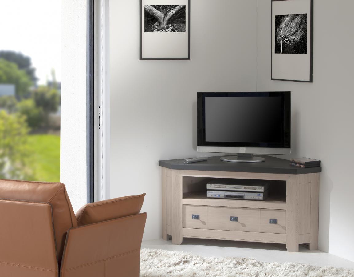 Le meuble TV d'angle WHITNEY meublera votre salon et vous apportera du rangement grâce à 1 niche et 1 grand tiroir.