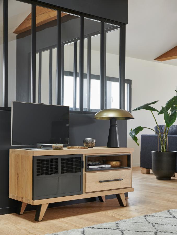 Le grand meuble TV de la collection GALLERY de style industriel chic s'insérera parfaitement dans votre salon et vous offrira beaucoup de rangement grâce à ses trois niches.