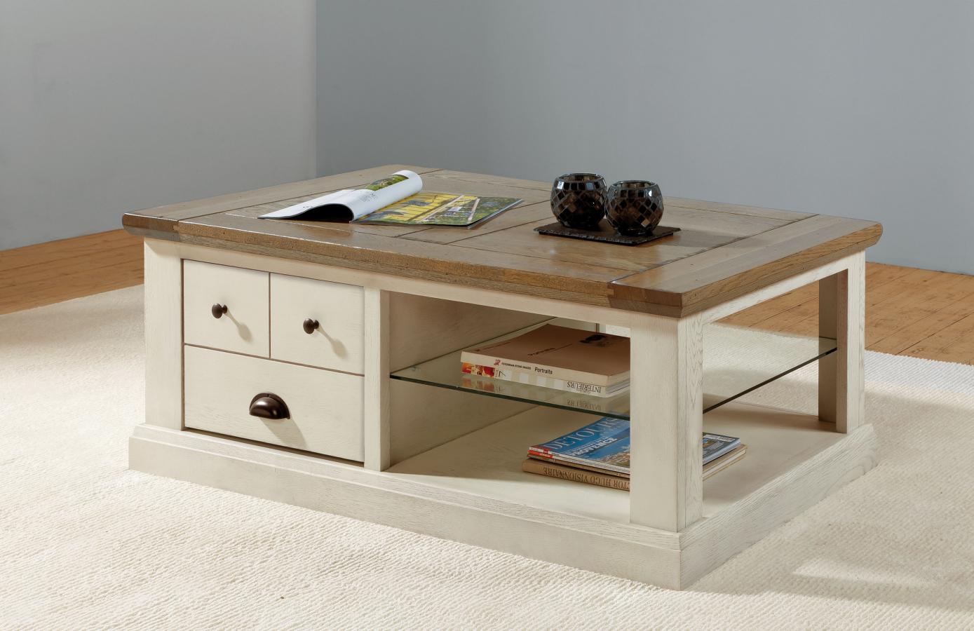 La table basse ROMANCE est très pratique avec son tiroir va-et-vient et son ouverture divisée d'une tablette en verre.