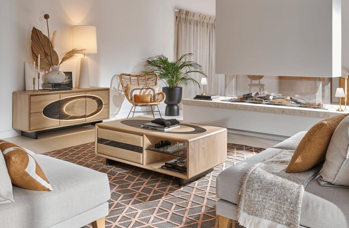 La table basse THALÈS allie chêne massif, détails en céramique marbrée et fonctionnalité avec son tiroir et sa niche avec tablette en verre grisé. Élégante et moderne, elle s’intègre parfaitement dans votre salon tout en offrant un rangement pratique pour vos objets du quotidien.