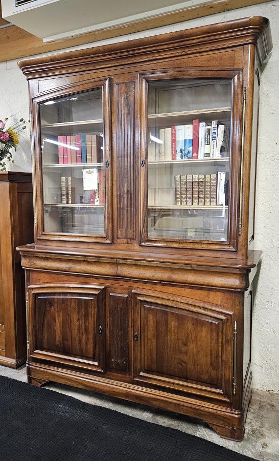 Bibliothèque 2 corps en noyer de France massif avec portes vitrées