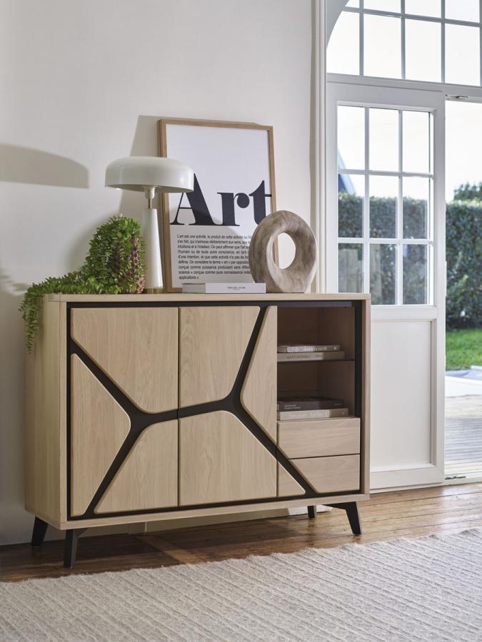 | Structures | Pieds meubles en multiplis bouleau toujours laqués noir mat. Côtés, planchers et dessus épaisseur 20 mm. Derrières en chêne, en abouté ou autre bois massif. Séparations en chêne massif ou abouté. Montants et traverses de cadre épaisseur 22 mm formant un fond creux entre portes ou tiroirs et caisse. Ce cadre est solidaire de la caisse. Si la teinte choisie pour le corps du meuble est identique à celle des portes et tiroirs, ce cadre sera en noir mat, sinon il sera de la teinte du corps. |