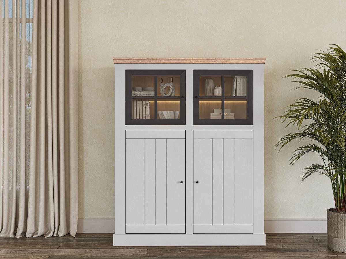 Le cabinet COSY 4 portes est fabriqué en chêne massif certifié Origine France Garantie, garantissant robustesse et durabilité. Ses 3 tablettes réglables et 1 tablette fixe offrent une organisation modulable, tandis que l’éclairage LED sensitif à l’arrière des tablettes en verre met en valeur vos objets décoratifs et collections. Les portes vitrées laquées en noir et le bi-ton sur le dessus et tablettes ouvertes apportent modernité et raffinement à ce meuble au design sobre et chaleureux.