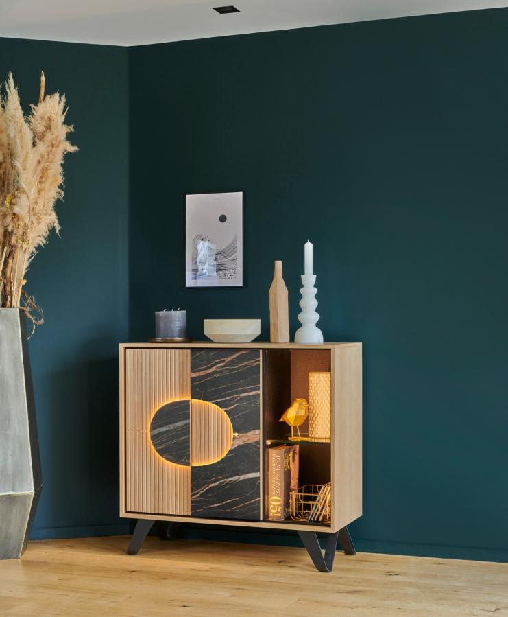 Ses 2 portes dissimulent un grand espace de rangement avec tablette intérieure, idéal pour y déposer accessoires, chaussures ou objets du quotidien. La niche ouverte accueille vos éléments décoratifs ou objets d’usage fréquent. Le cercle lumineux, signature visuelle de la collection, peut être mis en valeur grâce à un éclairage LED optionnel qui crée une ambiance douce et raffinée.