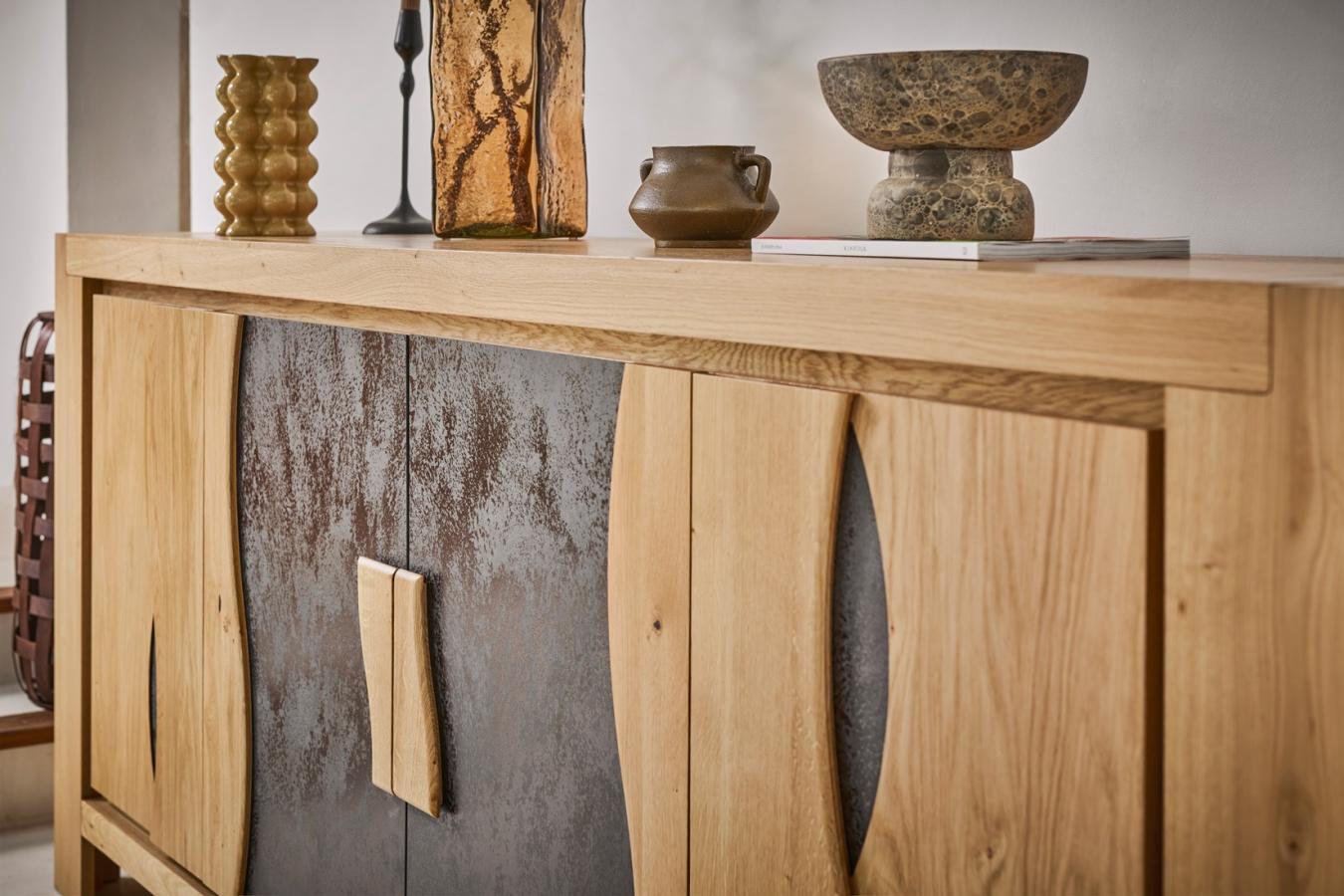 Élégante et sculpturale, l’enfilade LEGEND 4 portes L225 cm se distingue par ses courbes organiques en chêne massif et ses panneaux sombres texturés. Une pièce de caractère qui allie design, rangement et authenticité.