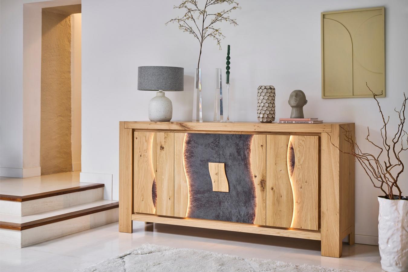 L’enfilade LEGEND 4 portes conjugue le charme du chêne massif sculpté et la modernité d’un éclairage LED subtil. Véritable pièce maîtresse, elle incarne l’esprit naturel et design de la collection LEGEND.
