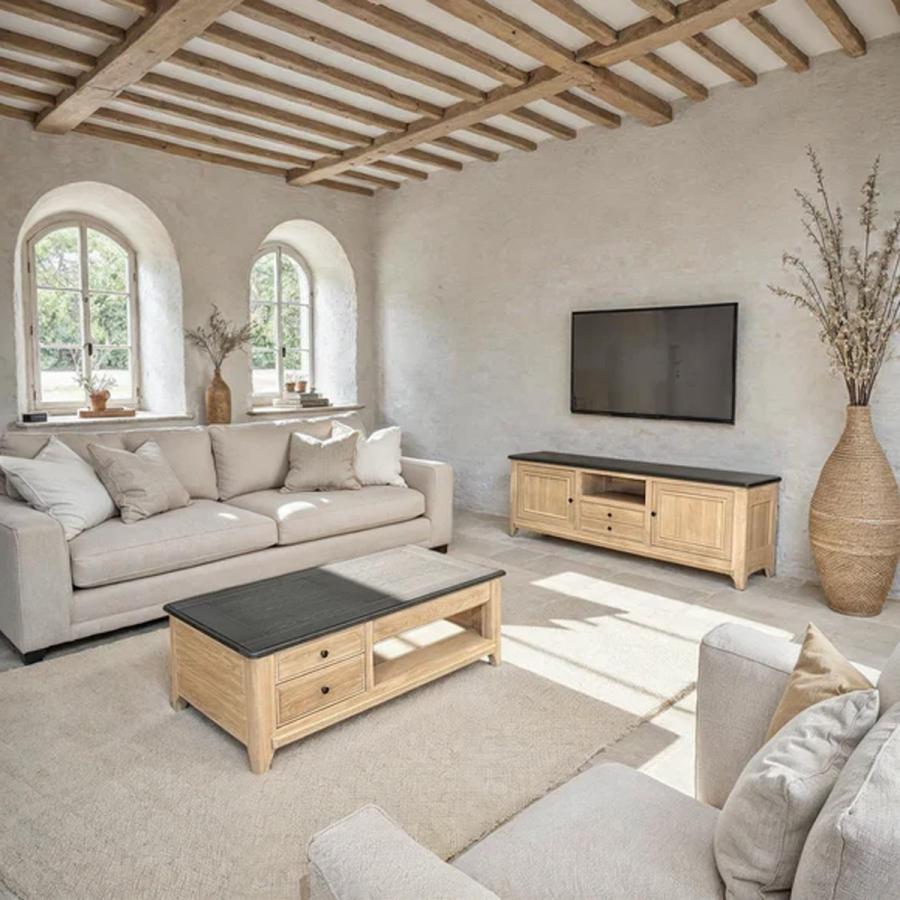 Le meuble TV VAUBAN en chêne massif associe élégance et fonctionnalité avec ses 2 portes, 1 tiroir et 1 niche centrale. Conçu en France, il offre de nombreux rangements et une finition authentique idéale pour un salon chaleureux et organisé.
