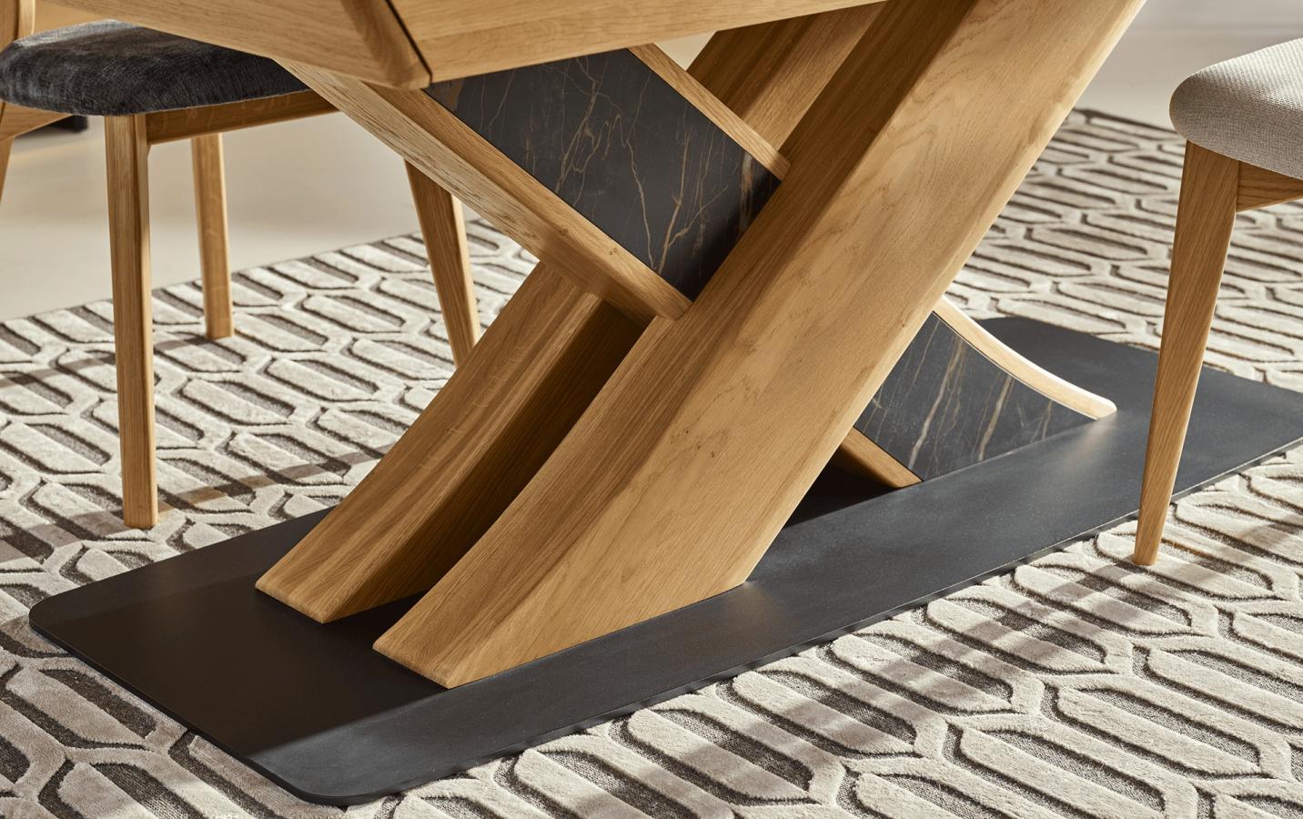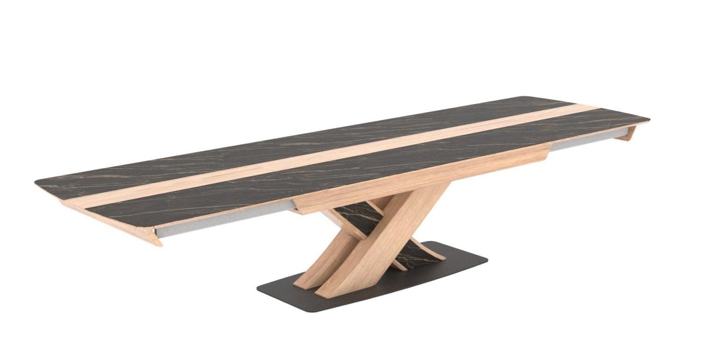 Le piètement central en chêne massif, orné d’une incrustation en céramique, et le chemin de table en chêne massif renforcent la solidité tout en apportant un style unique. L’ouverture par le milieu avec coulisses métalliques synchronisées assure une manipulation facile et fluide.