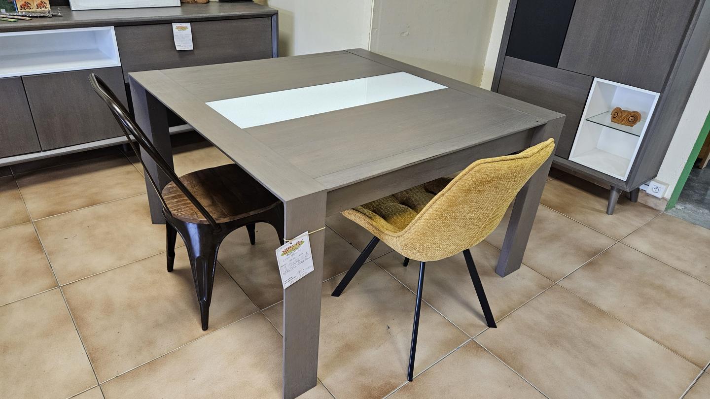 Table carrée 130x130 avec allonge en chêne massif et verre blanc GRISÉA