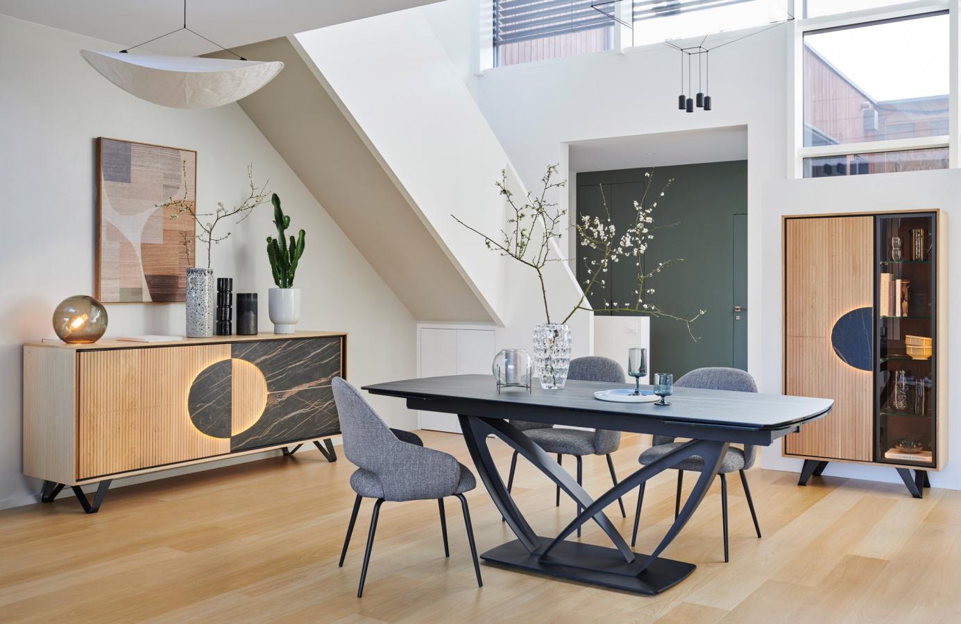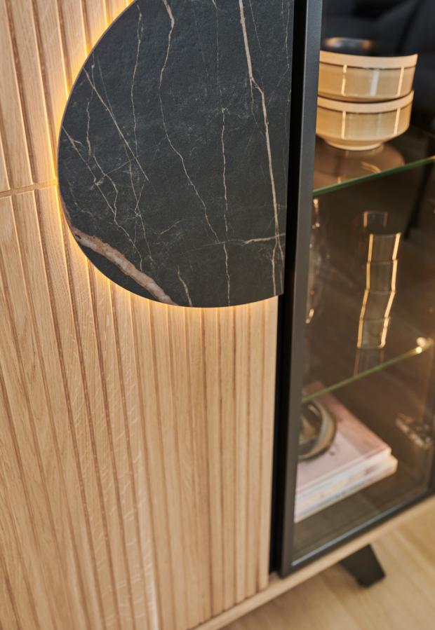 La partie vitrée, équipée de tablettes en verre, est parfaite pour exposer vaisselle, verrerie ou accessoires, tandis que la partie bois cache un espace de rangement fonctionnel derrière ses tablettes en bois massif. Le cercle noir central, signature de la collection, peut être sublimé par un éclairage LED optionnel pour une ambiance douce et chaleureuse.