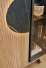 Structure Bois clair rainuré et façade noire marbrée, finition haut de gamme.