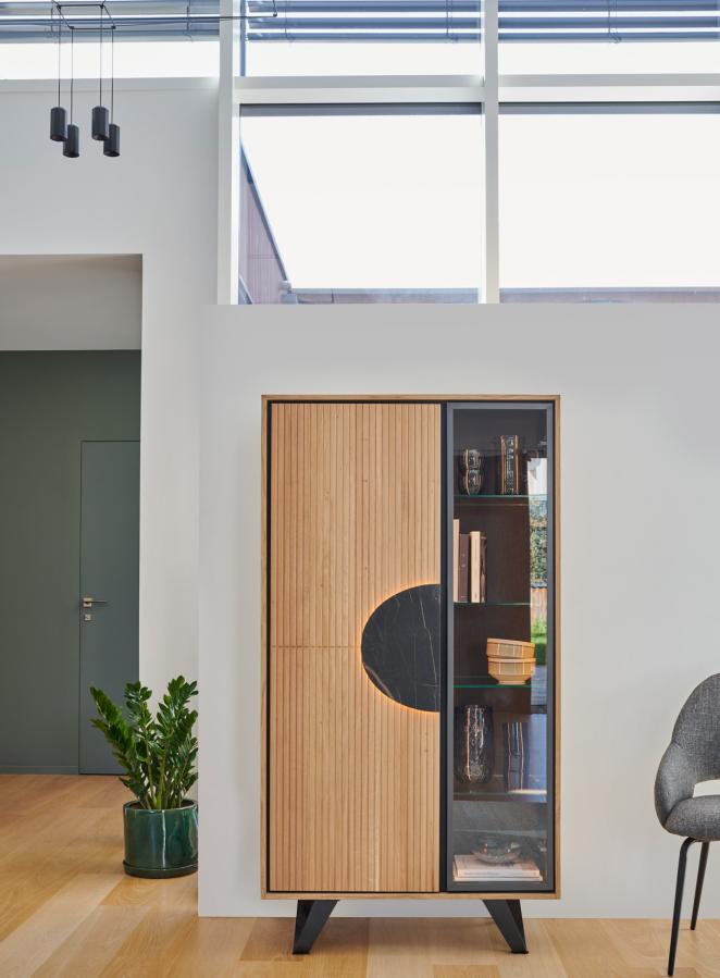 Élégante et contemporaine, la vitrine Sphère combine matériaux nobles et équilibre des lignes. Avec sa porte bois rainurée et sa porte vitrée, elle met subtilement en scène vos plus beaux objets et éléments décoratifs.